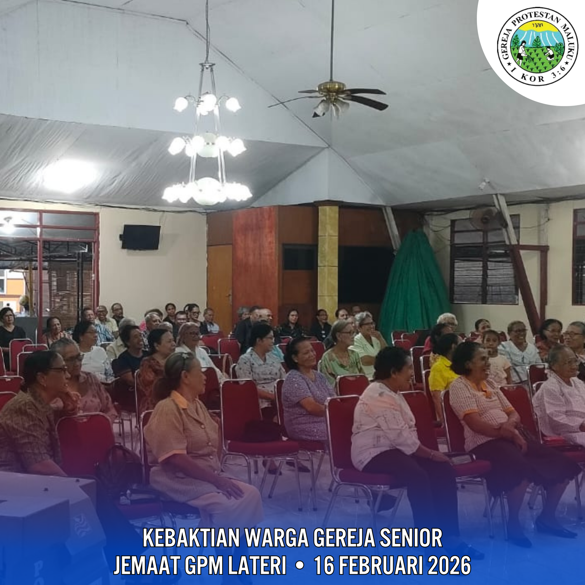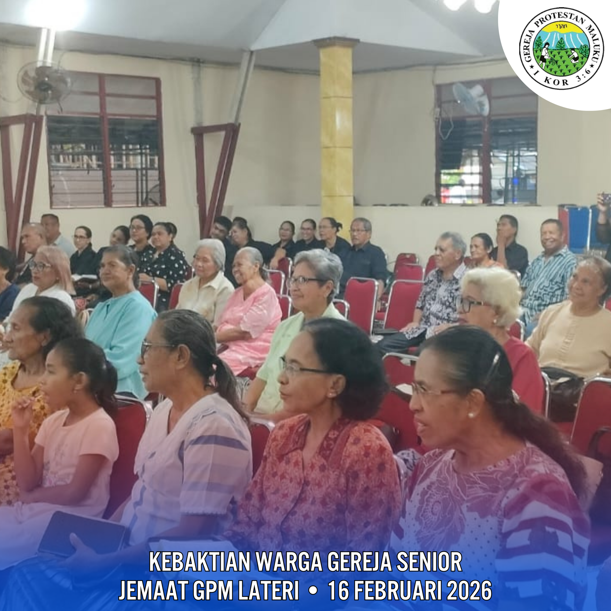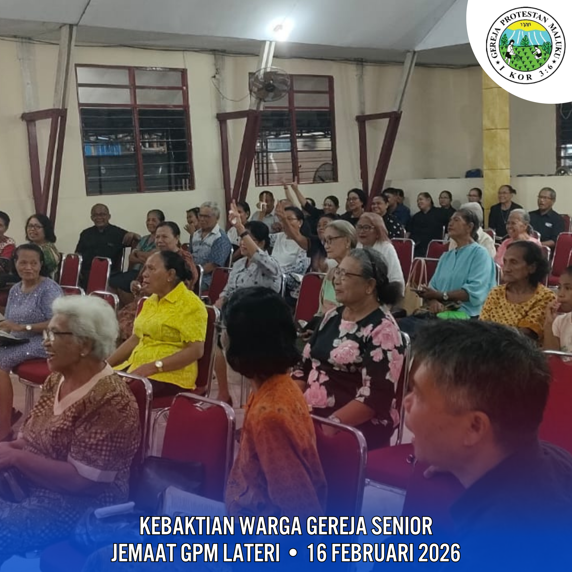 Kebaktian Warga Gereja Senior Jemaat Lateri yang dilaksanakan pada hari Senin, 16 Januari 2026 diikuti oleh Mama Papa Oma Opa dan Majelis Jemaat di pimpin oleh Ibu Pdt. S. Suripatty/N ini dikemas dalam bentuk kebaktian Kreasi.